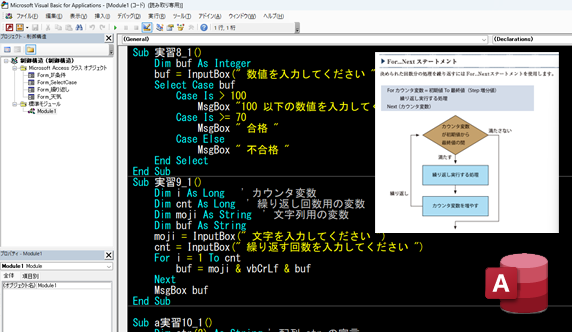 データベースの基礎知識 / VBAの基本(決まりごと・基本構文・実行方法) / 変数・定数・配列 /制御構造(IF・SelectCase・For Next・Do While・Do Until・With)/ 関数(文字列操作・日付操作・変換・評価・集計) / DoCmdオブジェクト / フォームとレポートの操作 / イベントプロシージャ / オブジェクト変数 / コレクション / SQL /デバッグ/ システム開発