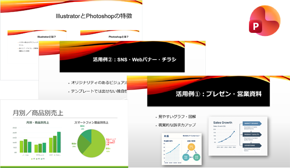 スライド作成の基本からスタートし、グラフや図表を使った説得力のあるスライドの作り方を学習します。